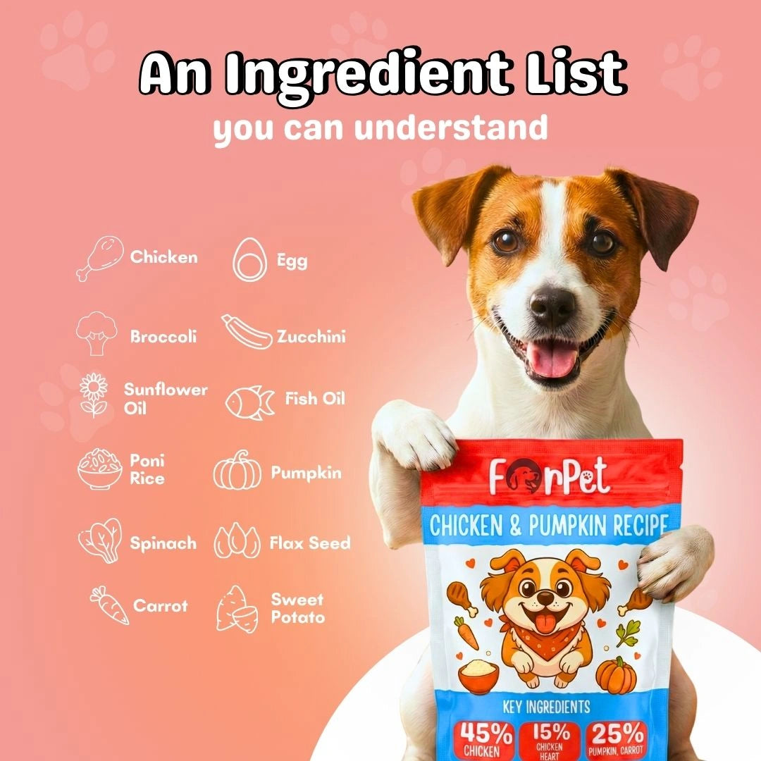 At ForPet, we use advanced thermal processing technology to naturally preserve our meals. Each recipe is sealed in a food-grade pouch, vacuum-packed, and gently heat-treated to cook and sterilise the food. This process locks in freshness, taste, and nutrition—without adding any preservatives, sugar, or artificial additives. No refrigeration needed until opened.